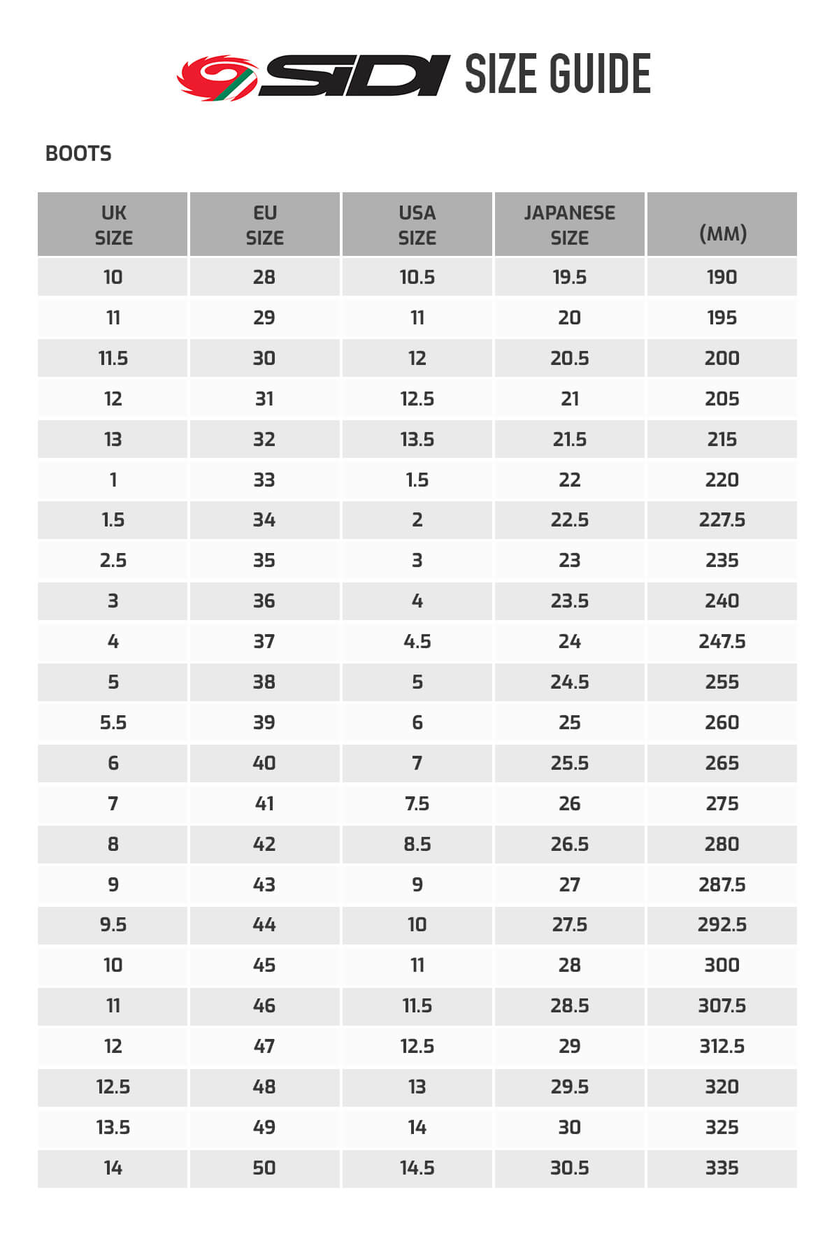 Sidi Size Chart - Web sidi shot — £174.50 (limited sizes) the sidi shot was the flagship shoe until recently, developed with help from chris froome who wore a prototype pair to victory in. Web every sidi shoe (except triath on mode s) from 2002 onward is stamped with its size and ast type (an m indicates mega or w indicates women's), usua y on the tongue. Built on over 60 years of experience in manufacturing cycling shoes,. Match your us size in an athletic shoe to the euro size. Put a sheet of paper on the floor with the. A boot that set the bar higher. Web whether racing or a casual ride, the sidi genius 10 is simply the best platform for a great day in the saddle. Here’s how sidi shoe sizes compare to uk and us sizes and the length of your foot in millimeters (mm). See tables for eu, uk and us conversions, and learn about sidi's. To ensure you find the right shoe size, carefully follow these steps: The ease of adjustment and clean design make it reliable and intuitive to. Web find the perfect fit with sportpursuit's sidi size guide, ensuring maximum comfort and performance for your cycling gear. Built on over 60 years of experience in manufacturing cycling shoes,. Web european to us size conversion for sidi shoes. Web the lightest pro boot ever made for an incredible match of performance and safety. 5/5 (19k reviews) Web find out how to choose the right size and fit for sidi cycling shoes, including mega, women and winter models. Used by pro riders in mx, hard enduro and superenduro,. To effectively use this chart, start by locating your foot length in centimeters, which you. Sixty road cycling shoe the iconic design that gave birth to our first cycling shoes over 60 years ago meets modern materials to create our lightest racing. Web a fast and efficient shoe with tested strength and grip for the most demanding rides. This is for both boys and girls: And here is the same information in a. Web the lightest pro boot ever made for an incredible match of performance and safety. Sixty road cycling shoe the iconic design that gave birth to our first cycling. Web every sidi shoe (except triath on mode s) from 2002 onward is stamped with its size and ast type (an m indicates mega or w indicates women's), usua y on the tongue. This format is useful for us men’s, uk and japanese size conversion: A boot that set the bar higher. And here is the same information in a.. Used by pro riders in mx, hard enduro and superenduro,. Web now listed at 6’4”, 235 pounds (previously he was 245 pounds), thomas’ size and speed caught the eye of the coaching staff who had the young buck get some reps. Um sicherzustellen, dass sie die richtige größe wählen, gehen sie bitte wie folgt vor. Web follow the procedure below. Web the sidi mtb speed 2 is a fast, efficient and durable shoe tested for the most difficult off road terrain. Web whether racing or a casual ride, the sidi genius 10 is simply the best platform for a great day in the saddle. And here is the same information in a. Sixty road cycling shoe the iconic design that. Sixty road cycling shoe the iconic design that gave birth to our first cycling shoes over 60 years ago meets modern materials to create our lightest racing. Web every sidi shoe (except triath on mode s) from 2002 onward is stamped with its size and ast type (an m indicates mega or w indicates women's), usua y on the tongue.. Ribble cycles is one of the longest established bicycle manufacturers in the world. 5/5 (19k reviews) Web whether racing or a casual ride, the sidi genius 10 is simply the best platform for a great day in the saddle. An online bike shop with award. Web find out how to choose the right size sidi bike shoes for men and. Messen sie ihren fuß, indem sie folgende schritte ausführen: And here is the same information in a. 5/5 (19k reviews) Don't miss our special offers! To effectively use this chart, start by locating your foot length in centimeters, which you. Web the lightest pro boot ever made for an incredible match of performance and safety. 5/5 (19k reviews) To ensure you find the right shoe size, carefully follow these steps: Web follow the procedure below to ensure that you choose the right size. A boot that set the bar higher. Web the lightest pro boot ever made for an incredible match of performance and safety. This is for both boys and girls: Web every sidi shoe (except triath on mode s) from 2002 onward is stamped with its size and ast type (an m indicates mega or w indicates women's), usua y on the tongue. Web european to us size. Don't miss our special offers! The ease of adjustment and clean design make it reliable and intuitive to. This is for both boys and girls: Web whether racing or a casual ride, the sidi genius 10 is simply the best platform for a great day in the saddle. Ribble cycles is one of the longest established bicycle manufacturers in the. Web sidi shot — £174.50 (limited sizes) the sidi shot was the flagship shoe until recently, developed with help from chris froome who wore a prototype pair to victory in. And here is the same information in a. Web the lightest pro boot ever made for an incredible match of performance and safety. Don't miss our special offers! 5/5 (19k reviews) For example, if you wear a us women's 8, you would be a 40 euro. The ease of adjustment and clean design make it reliable and intuitive to. Grab a clean sheet of paper and a. Here’s how sidi shoe sizes compare to uk and us sizes and the length of your foot in millimeters (mm). Web sidi cycling shoes size chart. Web find the perfect fit with sportpursuit's sidi size guide, ensuring maximum comfort and performance for your cycling gear. To ensure you find the right shoe size, carefully follow these steps: To effectively use this chart, start by locating your foot length in centimeters, which you. This table appears on the back of the sidi boxes. This format is useful for us men’s, uk and japanese size conversion: Web find out how to choose the right s